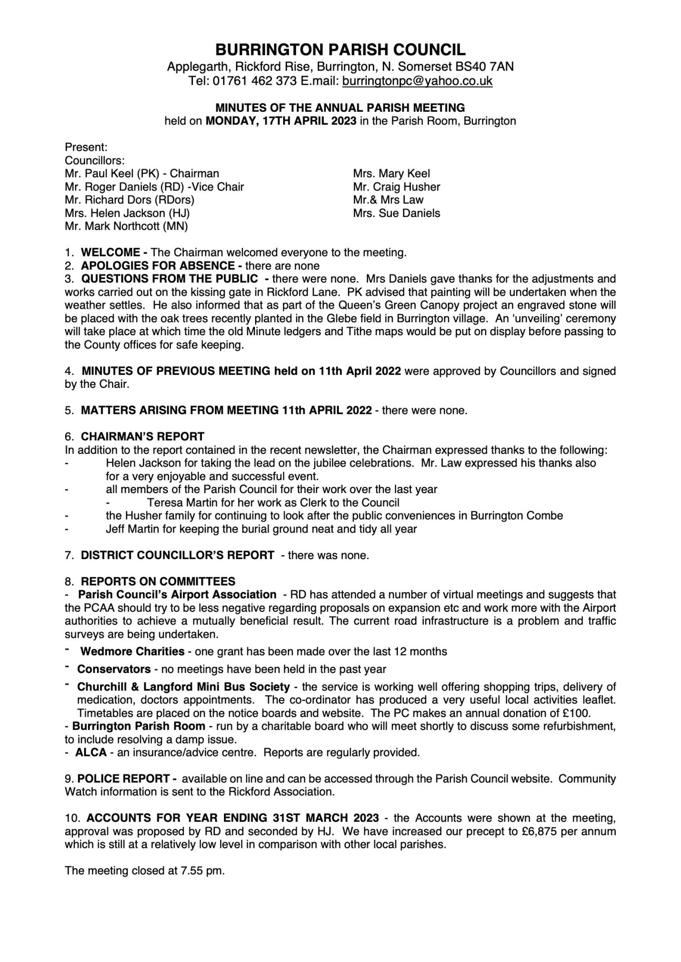2023-04-17 Annual Parish Council Meeting Minutes Add to Calendar ← Previous: 11th April 2022 Next: 22nd May 2023 → Documents PC Minutes AM 17 April 2023 Committees Full Council View all Meetings Popular Links When is the next council meeting?